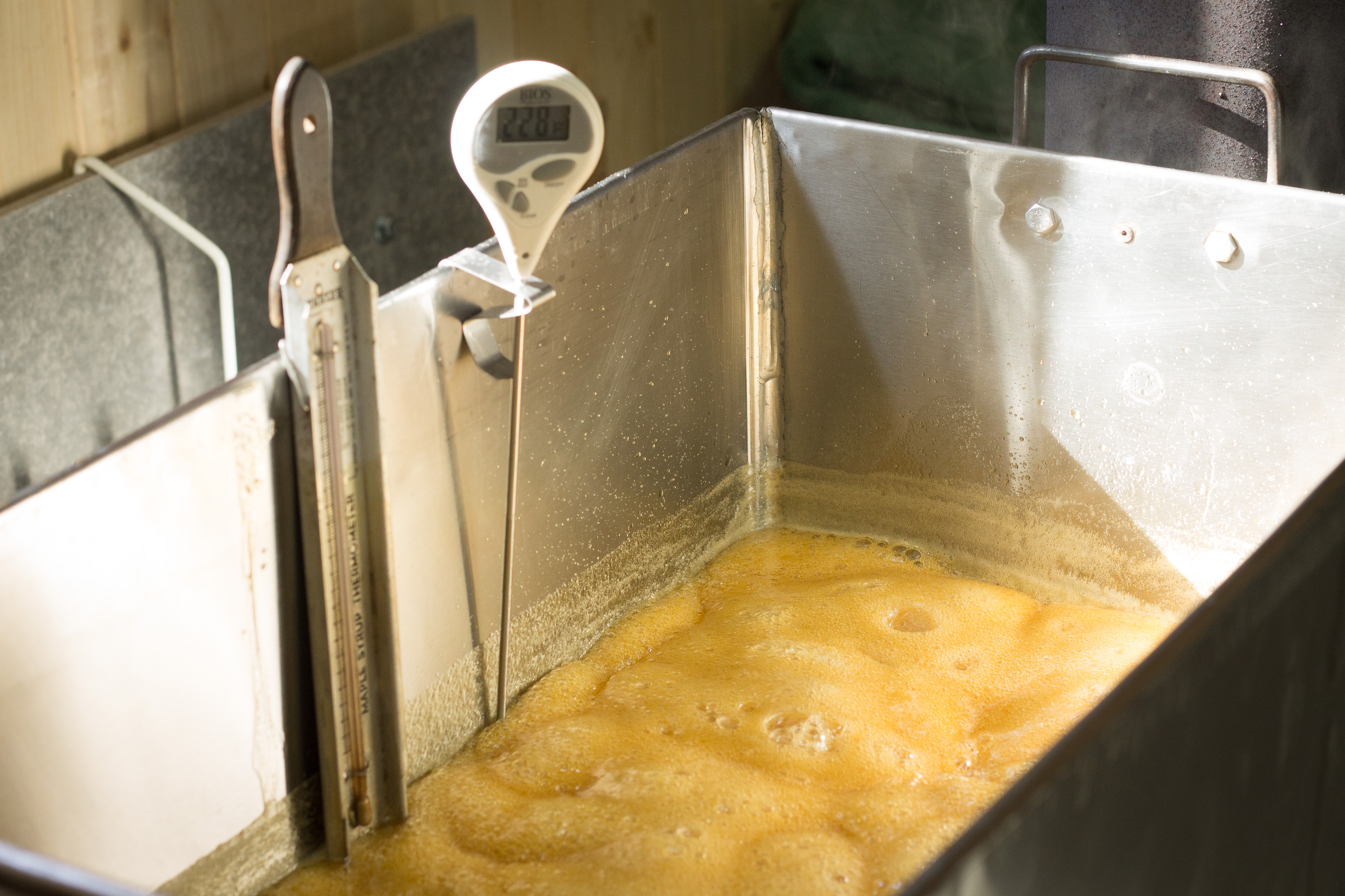 La température du sirop est montée à 185°F au bain-marie pour être cannée à chaud avec notre sertiseuse.